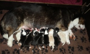 Last friday our Cat (Ch Big-Wood’s Catwalk) easily free whelped 10 puppies. Unfortunately 2 girls were stillborn, but 4 boys (2 tris & 2 ee-reds), 4 tricolour girls and their mom are doing fine. The proud father is Kennedy (Ch Cheysuli’s Tri To Remember). Perjantaina 17.8. Katti ( Big-Wood’s Catwalk) synnytti aamuyön tunteina 10 pentua. Kattimaiseen …